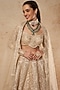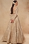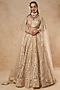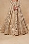 Featuring a beige lehenga in tulle base with gold foil and silk thread work. It is paired with a matching blouse and a dupatta having foil detailing.