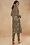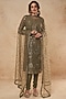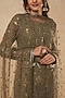 Featuring a mehndi green kurta in georgette base with gold foil and silk thread work. It is paired with matching crepe churidar pants and a tulle dupatta having foil detailing.