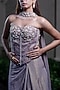 Featuring a champagne gold draped skirt in tissue chiffon base. It is paired with a hand-embroidered corset and dupatta. Accentuate it with statement jewellery and heels for cocktail or wedding ceremonies.