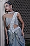 Featuring an ice blue drape saree in tissue chiffon base with pearl, swarovski, bead and cutdana hand embroidery. It is paired with a hand-embroidered blouse. Accentuate with diamond or polki jewelry, metallic heels, and a sleek clutch for a sophisticated look, perfect for receptions or cocktail events.