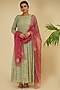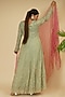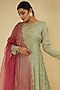 Featuring a mint green anarkali in handloom and soft tissue base with cutdana cutwork embroidery. It is paired with a contrasting pink pure organza dupatta and pants.