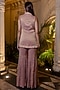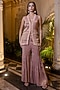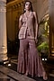 Featuring a peachish pink jacket in tissue chiffon base with pearls, beads, sequins, cutdana and swarovski hand embroidery. It is paired with kalidar sharara pants. Accentuate it with zircon jewellery and heels for an elegant look, Perfect for a festive occasion or sangeet ceremony.
