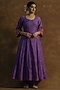 Featuring a purple anarkali in mul chanderi silk and silk base with cutwork, zari and thread hand embroidery. It is paired with matching stretch lycra satin churidar pants and a contrasting dupatta.