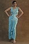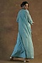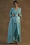 Featuring a sea green shrug in zari tissue chanderi base with mirror, cutdana, zari and thread embroidery. It is paired with a matching modal satin kurta and a draped skirt.