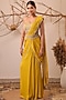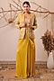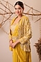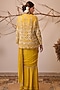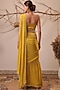 Featuring a yellow saree in chinon chiffon base with zari, zardosi, cutdana, sequins, mirror and pearl embroidery. It is paired with a chanderi silk tissue jacket, a gajji satin silk bustier and a belt. Accentuate it with statement jewellery, heels and a clutch for a festive occasion, wedding, sangeet, haldi or engagement ceremony.