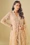 Featuring a champagne jacket in tulle base with cut beads, sequins and crystal hand embellishments. It is paired with a blouse, an organza flared palazzo and an embellished tulle dupatta. Accentuate it with statement jewellery and heels for an engagement or sangeet ceremony.