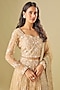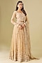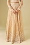 Featuring a champagne gold lehenga in tulle base with cut beads, sequins and thread embroidery. It is paired with a tulle choli and a handloom tissue embellished dupatta. Accentuate the designer lehenga with statement jewellery and heels for a wedding, engagement or sangeet ceremony.