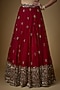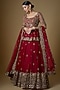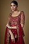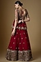 Featuring a chilli red lehenga in tulle base with zardosi, cut beads, sequins, crystal beads and zari hand embroidery. It is paired with a matching peplum blouse and a dupatta.