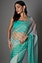 Featuring an ocean blue shaded draped saree in crystal organza base with steel grey bead hand embellishments. It is paired with an embroidered choli and an underskirt. Accentuate it with dangler earrings and heels for an engagement or wedding ceremony.
