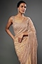 Featuring a rose gold draped saree in tissue georgette and tulle base with cutdana and cut-beads embellishments. It is paired with an embellished blouse and a drape pallu. Accentuate with statement jewellery and heels for a wedding or festive occasion.