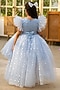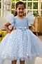 Featuring a blue dress for girls in net base with embroidery. Style it with cute hair accessories and sandals for birthday parties or special occasions.
