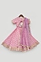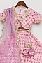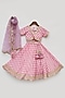 Featuring a pink lehenga for girls in cotton base with print and golden finishing. It is paired with a matching blouse and an organza dupatta having sequins and boota detailing.
