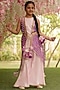 Featuring a pink and purple draped kurta jacket for girls in crepe base with dori tassels. It is paired with sharara and a belt. Style it with sandals and hair accessory for a festive occasion or wedding ceremony.