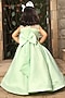 Featuring a pista green ball gown for girls in shimmer net base with feathers detailing and an attached cancan. Perfect wear for weddings, parties, or any special occasion.