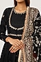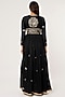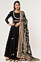 Featuring a black anarkali in chanderi silk, cotton and organza silk base with zari, zardosi, mukaish, and french knot hand embroidery. It is paired with a matching embroidered jacket, and a dupatta.