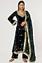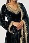 Featuring a teal anarkali in silk velvet base with bell sleeves, including dabka and zardosi hand embroidery. It is paired with matching embroidered palazzo pants and an organza silk dupatta.
