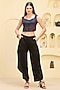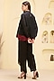 Featuring a black top in cotton satin and banana crepe base with a high-neckline, mirror and thread hand embroidery. It is paired with layered trousers. Ideal for festive parties where modern glamour takes the spotlight.