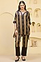 Featuring a black and golden kaftan top in linen satin, cotton satin and banana crepe base with a shirt collar, crystal embellishments and stripe print. It is paired with straight trousers. Ideal for festive parties where modern glamour takes the spotlight.