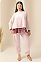 Featuring a blush pink top in cotton satin and banana crepe base with a high-neckline, mirror and thread hand embroidery. It is paired with layered trousers. Ideal for festive parties where modern glamour takes the spotlight.