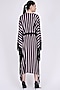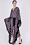 Featuring a dark blue cover-up in nylon satin base with printed stripes and black fringe. It is paired with a matching satin waist belt.