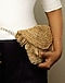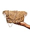Featuring a beige handcrafted moon crest sling bag in banana bark base. It has an ikat handloom cotton lining and a gold adjustable chain.