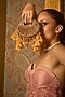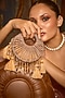 Featuring a golden handbag in suede and rexine base. Elevate your look by pairing this handbag with chic evening outfits, perfect for cocktail parties, festive celebrations or special occasions.