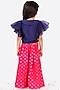 Featuring a blueberry crop top in dupion silk, jacquard, cotton, and organza base with butterfly sleeves. It is paired with contrasting candy pink pleated palazzo pants.