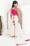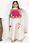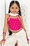 Featuring a rani pink strappy top for girls in dupion silk, cotton and net base base with zari motifs detail. It is paired with ivory jacquard floral sharara having an elasticated waistband, lacework and tassel detailing, including a dupatta. Style it with sandals and hair accessories for a festive occasion, wedding or sangeet ceremony.