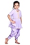 Featuring a purple peplum top in crepe and cotton satin base with thread work trims and gota details. It is paired with a matching tie-dye dhoti and a net dupatta.