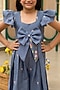 Featuring a blue jumpsuit for girls in denim base with embroidery. Style it with sandals and hair accessories for a birthday party celebration.
