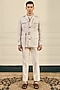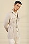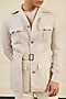 Featuring a candlelit beige safari shacket in linen herringbone base with a spread collar and flap pockets. It is paired with a belt. Accentuate it with tailored trousers and loafers for a refined look, ideal for travel outings, art exhibits or stylish brunches.