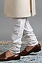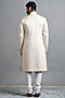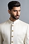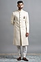 Featuring a cream ivory sherwani in jacquard base with golden buttons. It is paired with a kurta and churidar. Style it with mojaris for a wedding or engagement ceremony.