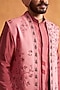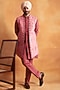 Featuring a blush coral jacket in silk base with embroidery. It is paired with contrasting creamy coral pants and a tonal kurta.