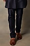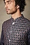 Featuring a dark blue bundi jacket in linen base with machine embroidery. It is paired with a matching cotton silk kurta and pants.