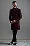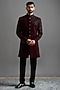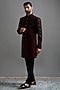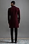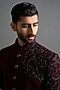 Featuring a deep maroon indowestern in polyester base with hand embroidery. It is paired with trousers. Style it with mojaris for a wedding, sangeet or engagement ceremony.