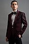 Featuring a deep wine tuxedo in polyester base with satin shawl lapel and hand embroidery. It is paired with trousers. Accentuate it with shoes for a reception, cocktail, engagement or wedding ceremony.