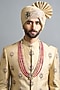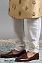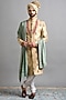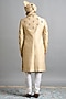 Featuring a gold-beige sherwani in raw silk base with hand embroidery. It is paired with a kurta and churidar. Style it with mojaris for a wedding or engagement ceremony.