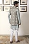 Featuring a green open jacket in poly silk base with cotton embroidery. It is paired with an embroidered kurta and pants. Accessorize this set with a pair of loafers for festive occasions.