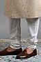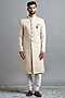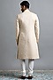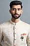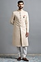 Featuring an ivory sherwani in jacquard base. It is paired with a kurta and churidar. Style it with mojaris for a wedding or engagement ceremony.