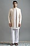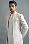 Featuring an ivory indowestern in japanese fabric base with machine embroidery. It is paired with a kurta and pants. Style it with mojaris for a wedding, sangeet or engagement ceremony.