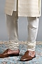 Featuring an ivory sherwani in raw silk base with dori and hand embroidery. It is paired with a kurta and churidar. Style it with mojaris for a wedding or engagement ceremony.