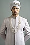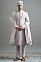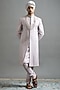 Featuring a lavender-grey sherwani in chanderi base with sequins and threadwork. It is paired with a kurta and churidar. Style it with a safa and mojaris for a wedding or engagement ceremony.