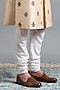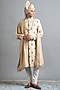 Featuring a light peach sherwani in raw silk base with hand embroidery. It is paired with a kurta and churidar. Style it with mojaris for a wedding or engagement ceremony.