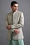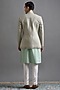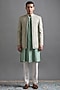 Featuring a mint green jacket in dupion base with thread embroidery. It is paired with a kurta and pants. Accentuate it with mojaris for a wedding, engagement or sangeet ceremony.