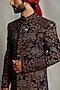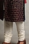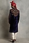 Featuring a navy blue sherwani in velvet base with embroidery. It is paired with contrasting off-white pajama pants and a kurta.