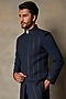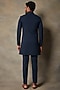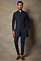 Featuring a navy blue indo western jacket in structured polyester viscose base with taping embellishments. It is paired with matching polyester pants.