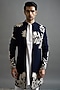Featuring a navy indowestern jacket in polyester base with threadwork and floral motifs embroidery. It is paired with a kurta and pants. Accentuate it with mojaris for a wedding, engagement or sangeet ceremony.