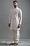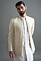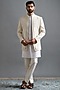 Featuring a pristine ivory jacket in dupion base with zari and thread embroidery. It is paired with a kurta and pants. Accentuate it with mojaris for a wedding, engagement or sangeet ceremony.