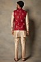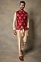 Featuring a red bundi jacket in linen base with block print. It is paired with a contrasting cotton silk kurta and pants.