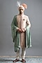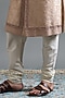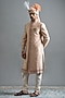 Featuring a rose peach sherwani in cotton silk base with embroidery and threadwork. It is paired with a kurta and churidar. Style it with a safa and mojaris for a wedding or engagement ceremony.